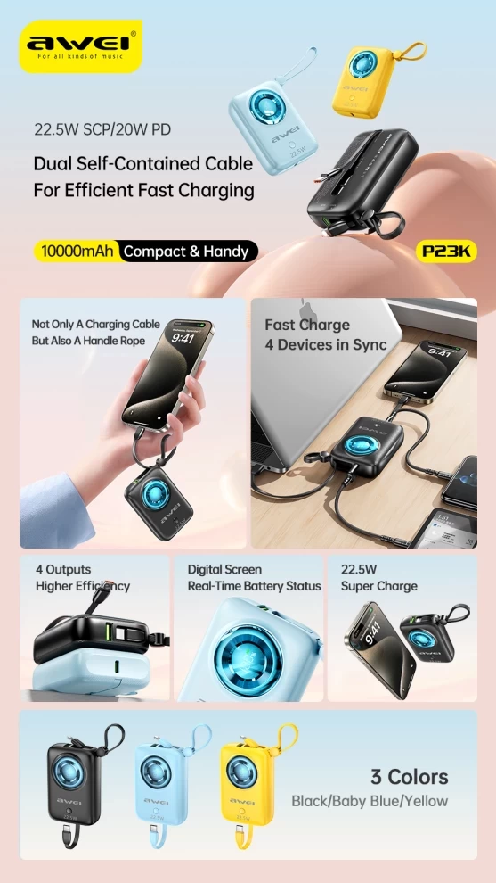 Awei 10000 mAh POWER BANK Mini Fast Charging With Built in cable